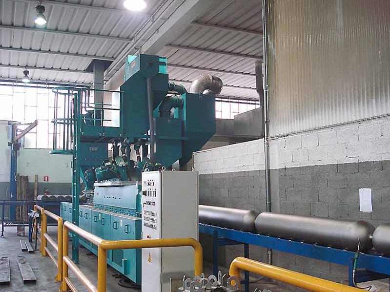 四川成都鋼瓶外壁拋丸機(jī)采用螺旋轉(zhuǎn)盤式輥道輸送機(jī)制,將鋼管螺旋輸送到拋丸區(qū) 域進(jìn)行拋丸處理,通過鋼管的旋轉(zhuǎn),達(dá)到全面 的拋丸覆蓋。減少了對(duì)工件的碰撞、損傷現(xiàn)象 ,降低了機(jī)器的噪聲; 該機(jī)采用Q034型懸臂離心式拋丸器,具有使用 壽命長(zhǎng)、結(jié)構(gòu)簡(jiǎn)單、故障率低等特點(diǎn); 采用風(fēng)選式分離器,具有良好的分離效果和較高的生產(chǎn)率,對(duì)提高葉片壽命有積極的作用; 采用布袋式除塵器,粉塵排放濃度低于國(guó)家的標(biāo)準(zhǔn),改善了工人的勞動(dòng)環(huán)境;